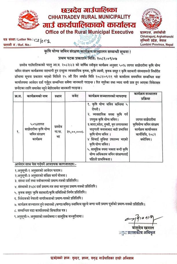 कृषि योग्य जमिन संरक्षण कार्यक्रम सञ्चालन सम्बन्धी सूचना !