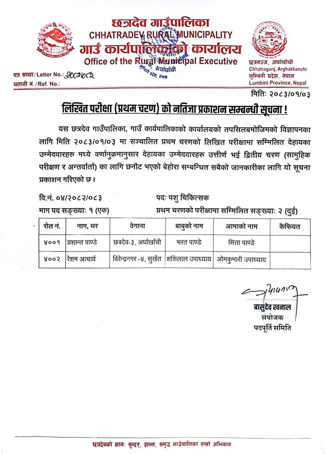 Home » " लिखित परीक्षा (प्रथम चरण ) को नतिजा प्रकाशन सम्बन्धी सूचना ! "