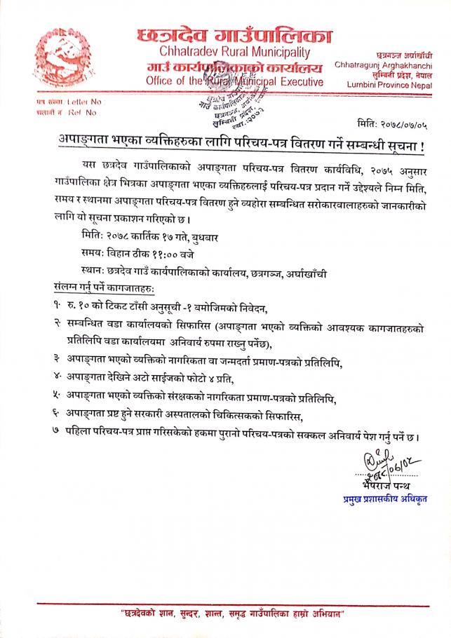 अपाङ्गता परिचयपत्र वितरण सम्बन्धि सूचना