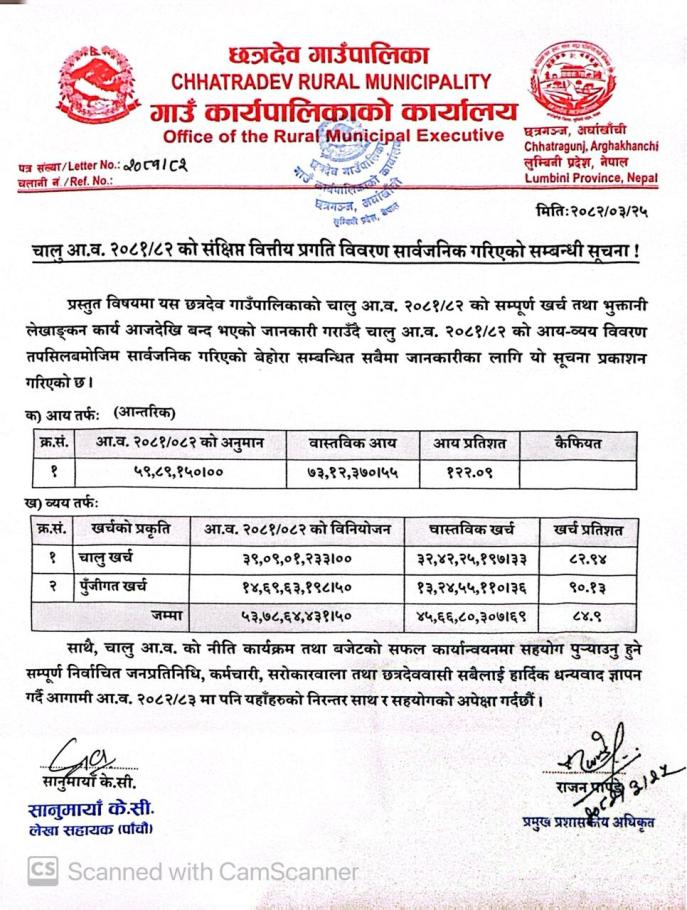 चालु आ.व. २०८१/८२ को संक्षिप्त वित्तीय प्रगति विवरण सार्वजनिक गरिएको सम्बन्धी सूचना !