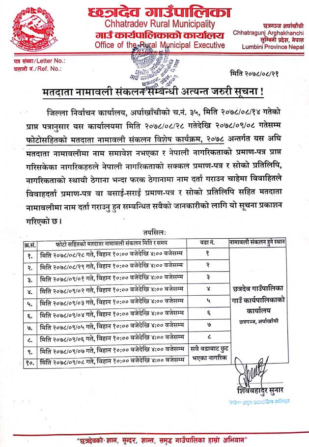 मतदाता नामावली संकलन सम्बन्धी सूचना ।