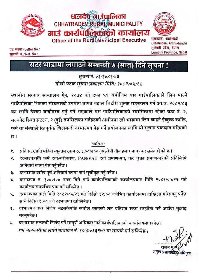 सटर भाडामा लगाउने सम्बन्धी दोस्रो पटक प्रकाशित ७ (सात) दिने सूचना !