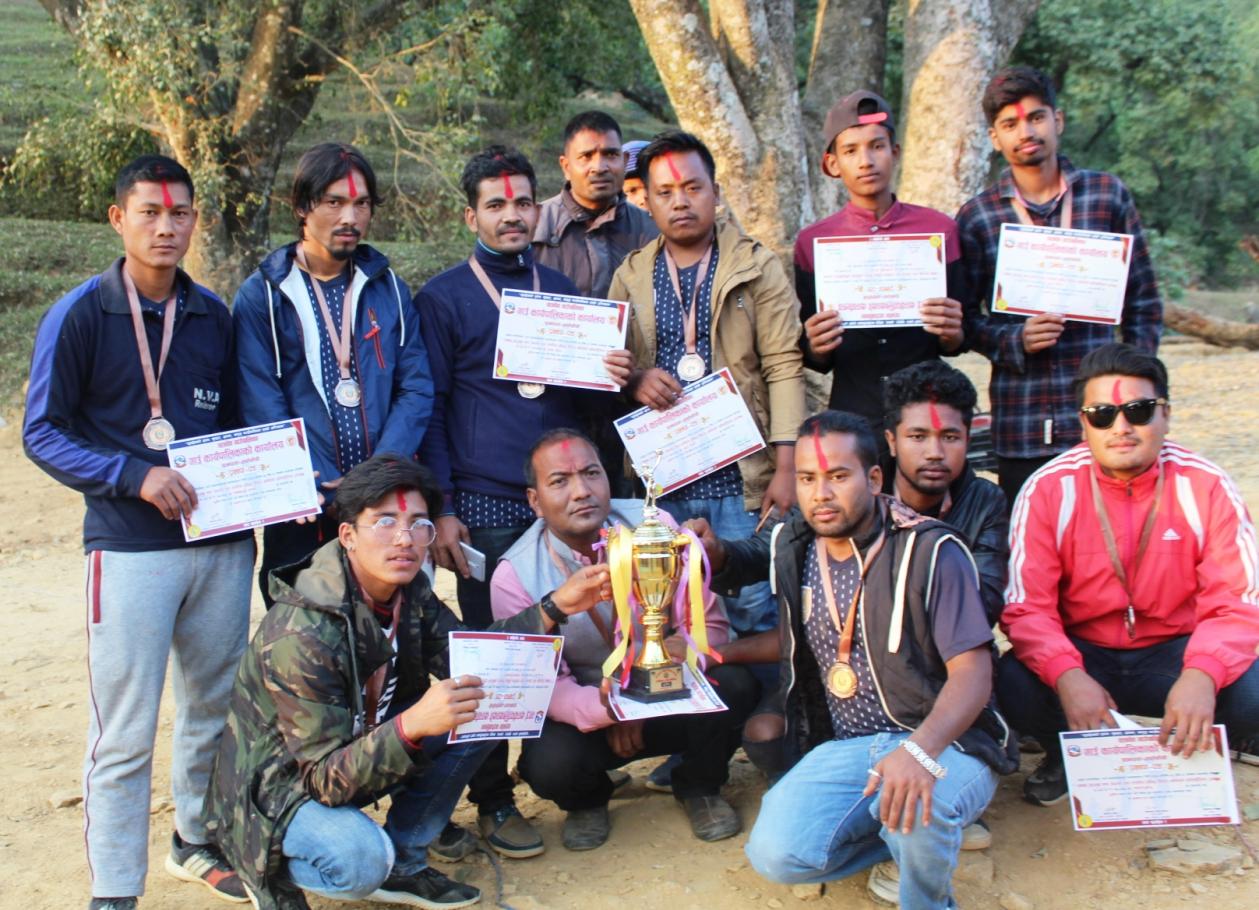 अध्यक्ष कप रनिङ्ग शिल्ड भलिवल प्रतियोगिता २०७५ काे समापन समारोह आयाेजक र बिजेता खेलाडिहरु सँग तस्बिर लिदै ।