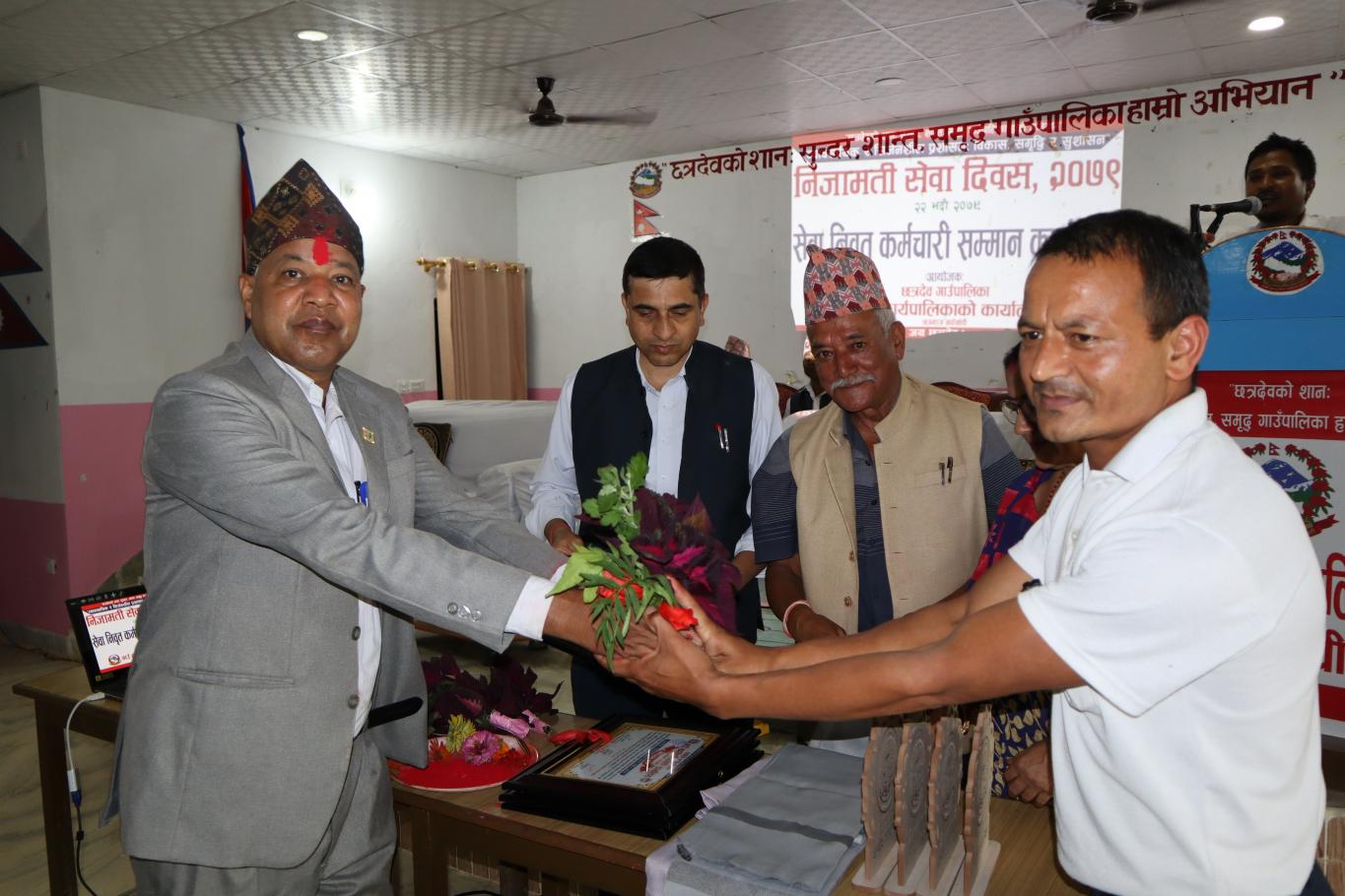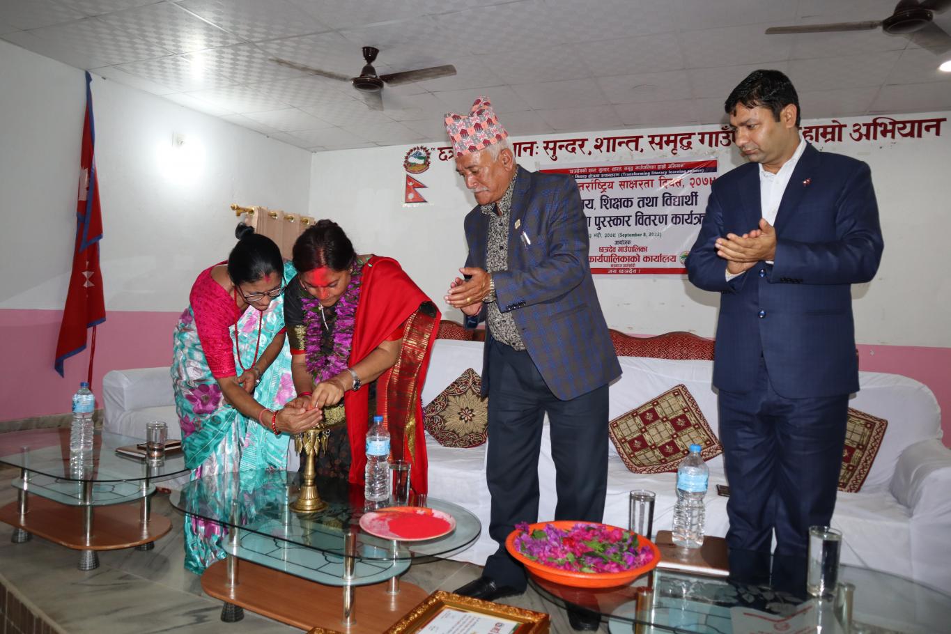 ५६ औं अन्तराष्ट्रिय साक्षरता दिवसको अवसरमा छत्रदेव गाउँपालिका द्वारा आयोजित विद्यालय शिक्षक तथा उत्कृष्ट विद्यार्थी सम्मान कार्यक्रमा तश्बिरहरु ।कार्यक्रमको अध्यक्षता गाउँपालिका अध्यक्ष श्री चन्द्रमान श्रेष्ठज्यूले गर्नुभएको थियो , कार्यक्रमको प्रमुख अतिथि प्रतिनिधि सभाका उपसभामुख माननिय श्री पुष्पा भुसाल गौतम ज्यूले गर्नुभएको थियो। उक्त कार्यक्रममा सेवा निवृत हुनुभएका शिक्षक , उत्कृष्ट विद्यालय र उत्कृष्ट GPA प्राप्त गर्ने विद्यार्थीहरुलाई नगद र प्रमाण पत्र सहित सम्मान गरि उक्त कार्यक्रम समापन गरियो ।