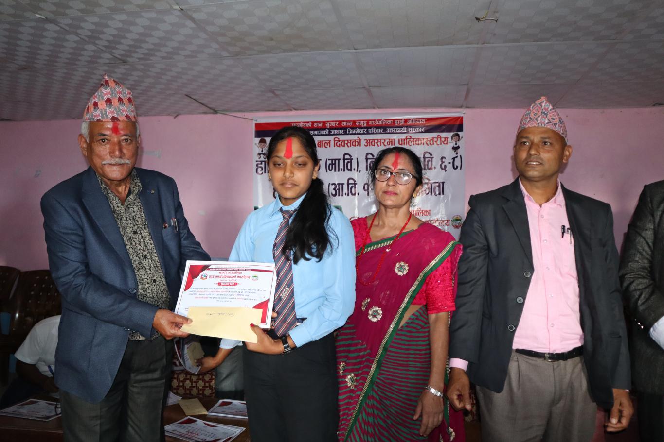 ५८ औं राष्ट्रिय बाल दिवसको अवसरमा छत्रदेव गाउँपालिका द्वारा आयोजित पालिकास्तरिय हाजिरीजवाफ(मा.वि) निबन्ध लेखन (आ.वि ६-८) र हस्तलेखन (आ.वि १-५) प्रतियोगिता सम्पन्न भयो उक्त प्रतियोगितामा हाजिरीजवाफ तर्फ प्रथम श्री सरस्वती मा.वि छत्रदेव-७ भुस्कात, द्वितीय श्री नेपाल राष्ट्र मा.वि छत्रदेव-६ ठूलापोखरा र तृतीय श्री मालिका इङ्गलिस बोर्डिङ्ग स्कुल छत्रदेव-६ ठूलापोखरा , निबन्ध लेखन तर्फ प्रथम श्री मालिका इङ्गलिस बोर्डिङ्ग स्कुल छत्रदेव-६ ठूलापोखराकी छात्रा श्री सुप्रिया के.सी ,द्वितीय श्री जनकल्याण मा.वि छत्रदेव-७ भगवती तारुभतेराकी छात्रा श्री बिनिता पाण्डे,तृतीय श्री सार्वजनिक मा.वि छत्रदेव-५ छत्