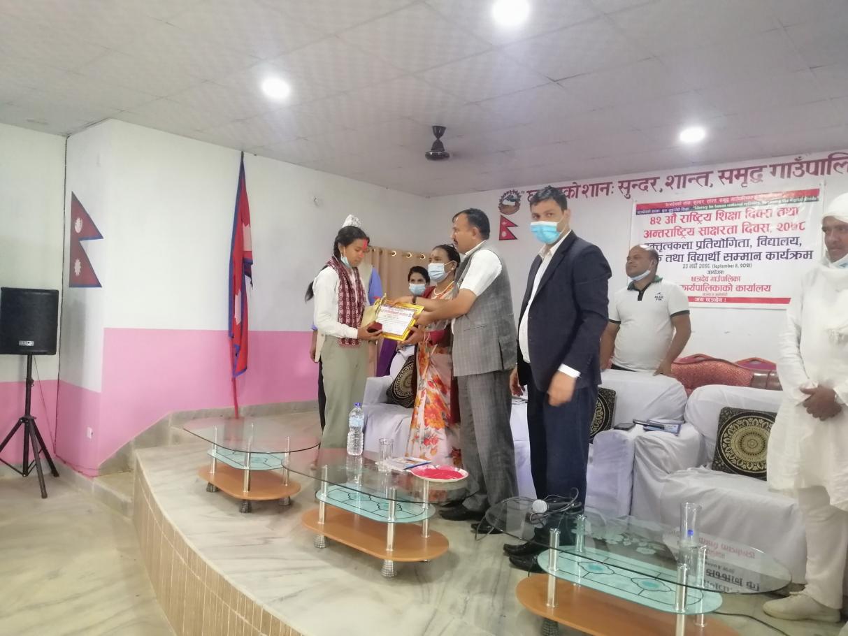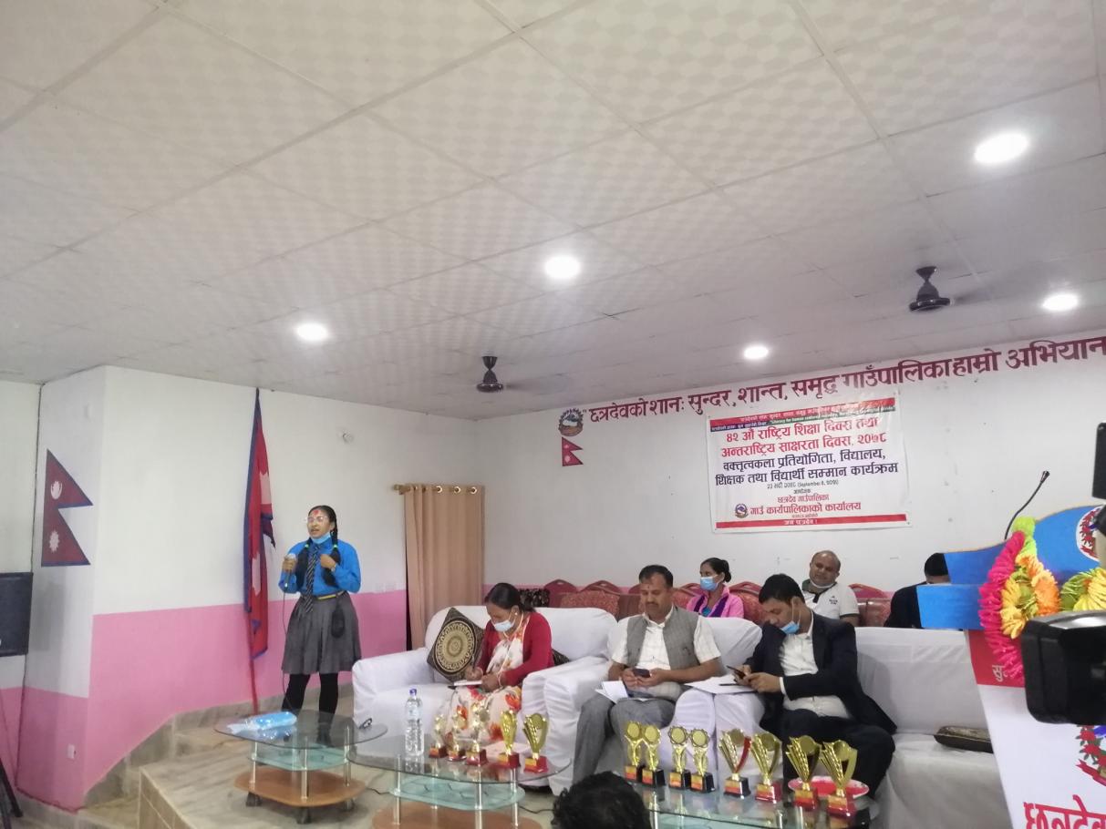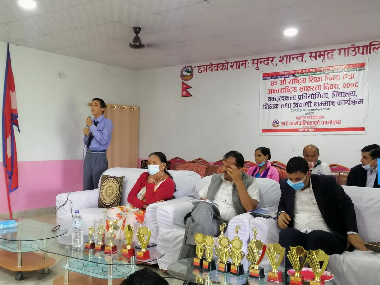 ४२ औ शिक्षा दिवस एवं अन्तराष्ट्रिय साक्षारता दिवसको अबसरमा छत्रदेव गाउँपालिकाले आयोजना गरेको "कोभिड -१९ र शिक्षामा यसको प्रभाव" विषयमा माद्यामिक तह वक्तृत्वकला प्रतियोगिता एवं शैक्षीक सत्र २०७७ मा शिक्षक सेवावाट निवृत हुनुभएका शिक्षकहरुलाई सम्मान तथा शैक्षीक सत्र २०७७ मा आधारभूत तह/SEE/कक्षा १२ मा उत्कृष्ट अङ्गक ल्याउने विद्यार्थी र विद्यालयलाई सम्मान कार्यक्रम गरि मनाईयो वक्तृत्वकला प्रतियोगितामा प्रथम हुन सफल श्री सरस्वती माध्यमिक विद्यालय छत्रदेव-७ , द्वितिय हुन सफल श्री चन्द्र माध्यमिक विद्यालय छत्रदेव-१ र तृतीय हुन सफल श्री सरस्वती माध्यमिक विद्यालय छत्रदेव-८ सूर्यथुम लाई हार्दिक बधाई