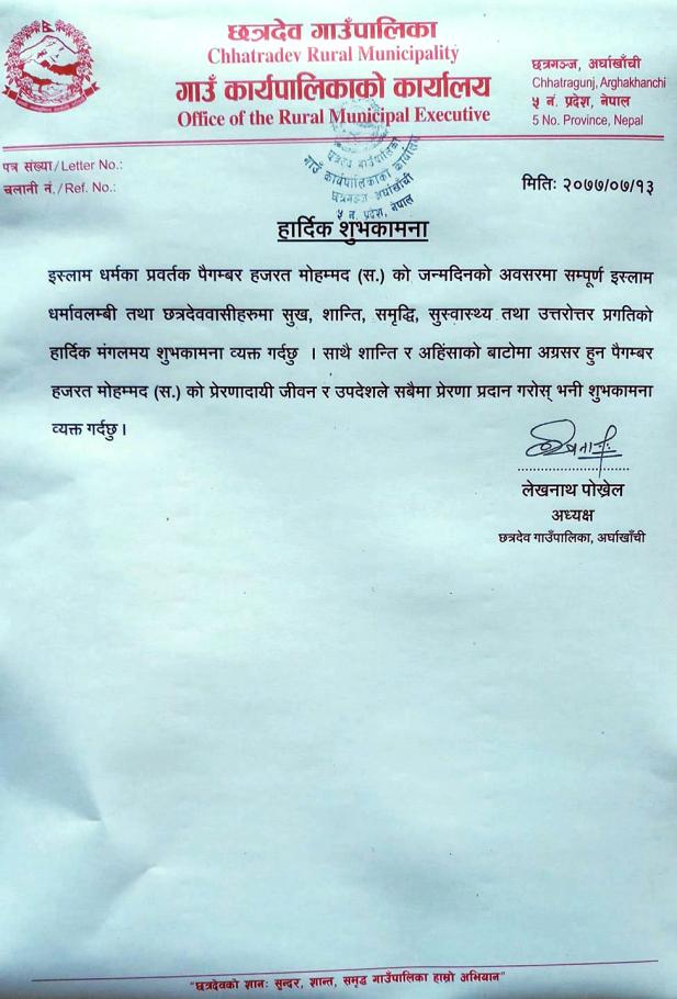 इस्लाम धर्मका प्रवर्तक पैगम्बर हजरत मोहम्मद (स.) को जन्मदिनको अवसरमा सम्पूर्ण इस्लाम धर्मावलम्बी तथा छत्रदेववासीहरुमा सुख, शान्ति, समृद्धि, सुस्वास्थ्य तथा उत्तरोत्तर प्रगतिको हार्दिक मंगलमय शुभकामना व्यक्त गर्दछौं । साथै शान्ति र अहिंसाको बाटोमा अग्रसर हुन पैगम्बर हजरत मोहम्मद (स.) को प्रेरणादायी जीवन र उपदेशले सबैमा प्रेरणा प्रदान गरोस् भनी शुभकामना व्यक्त गर्दछौं ।